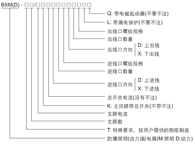 ● BXM(D)係類防(fáng)爆照明(動力)配(pèi)電箱,可根據用戶要求進(jìn)行特(tè)殊設(shè)計,用戶需提供(gòng)電氣係統圖。