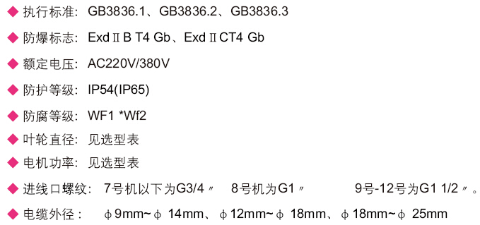 ● 通風機由防爆電動機、葉輪、風筒、防護罩等組成;